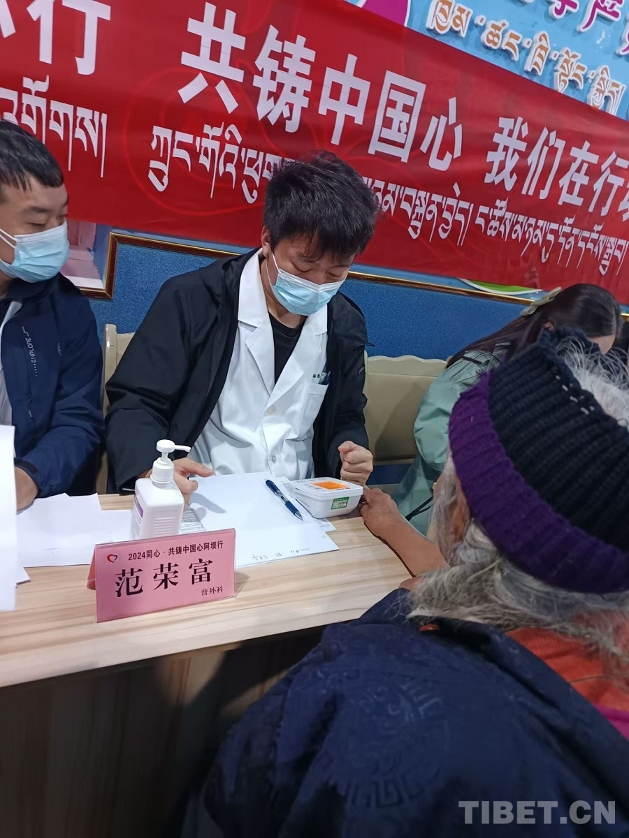 圖為中國康復(fù)研究中心普外科專家范榮福為當(dāng)?shù)厝罕娍丛\ 攝影:賈春玲