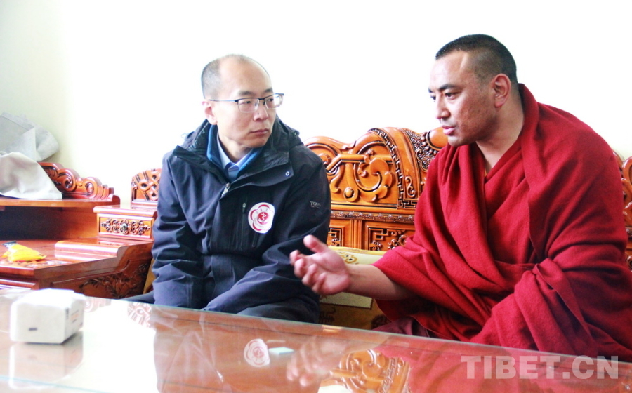 圖為若爾蓋郎木寺藏醫(yī)院院長供曲達(dá)吉(左)與北京同心共鑄公益基金會代表共同為“同心衛(wèi)生室”揭牌 攝影:劉莉