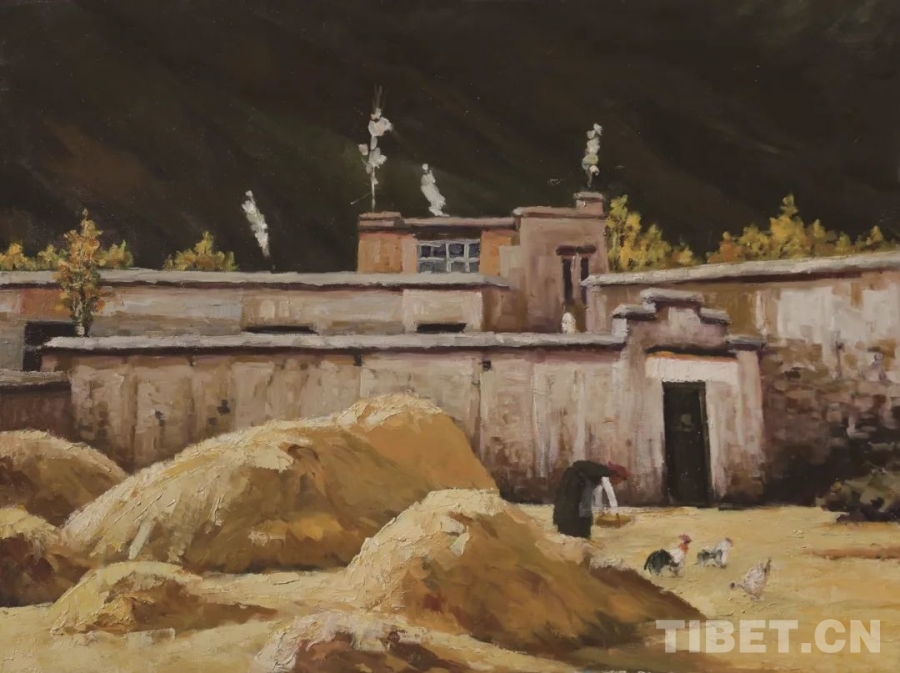 圖為“藍(lán)天白云——雪域高原油畫作品巡展”作品《金秋農(nóng)舍》(60x80cm 布面油畫)作者:丹增朗杰