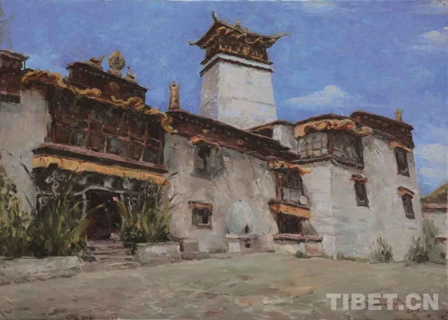 圖為“藍(lán)天白云——雪域高原油畫作品巡展”作品《桑嘎古多》(50x70cm 布面油畫)作者:扎西次仁