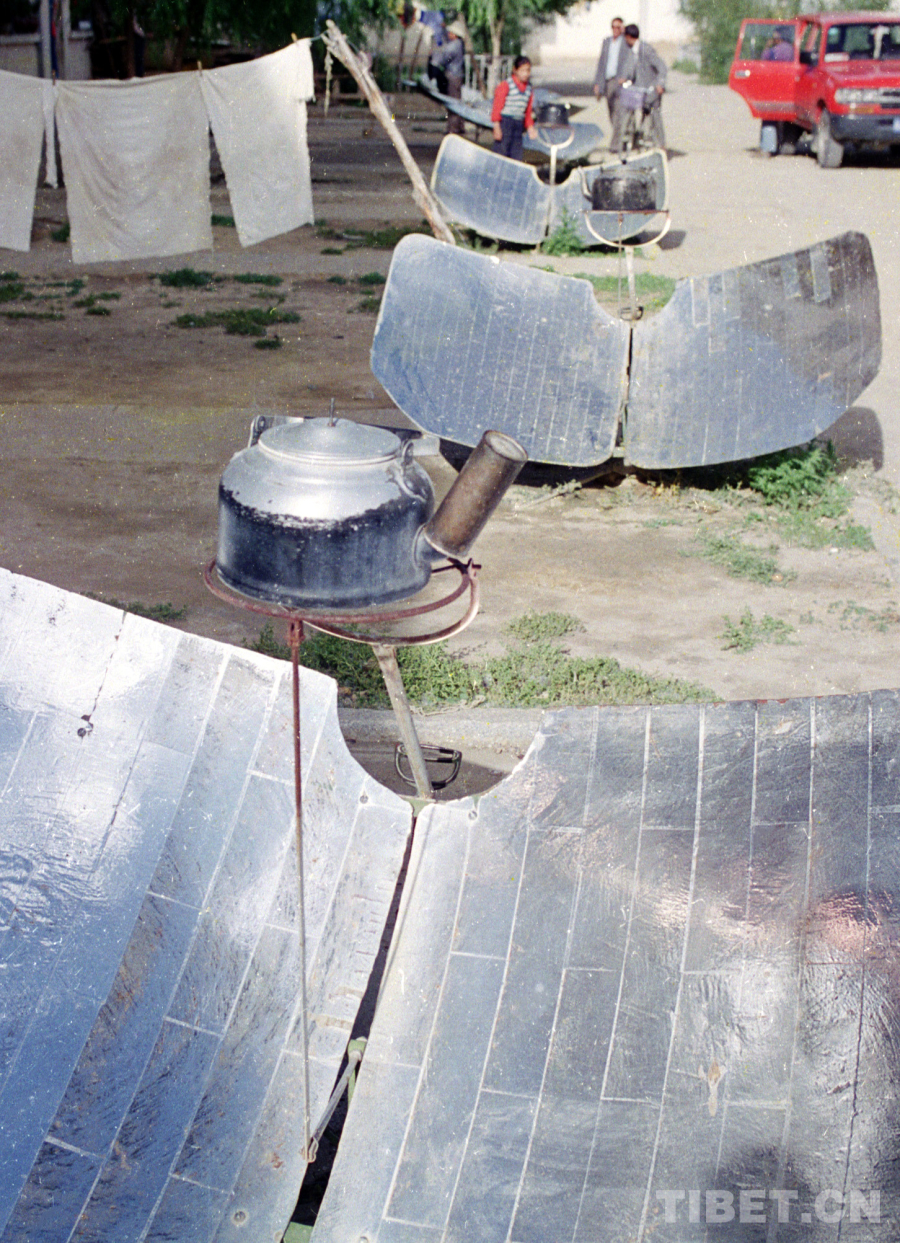這讓我不禁想起1987年,我沿著青藏公路一路采訪(fǎng)進(jìn)藏,在藏北高原房前屋后,見(jiàn)到大量正在使用特殊燒水裝置太陽(yáng)灶的情景。