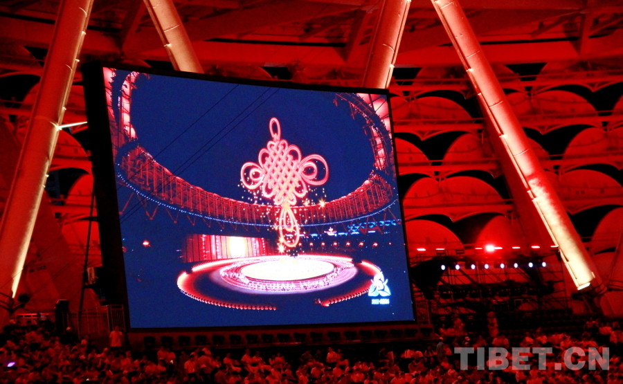 圖為第十二屆全國少數(shù)民族傳統(tǒng)體育運動會開幕式上以高科技方式呈現(xiàn)的中國結(jié) 攝影:劉莉