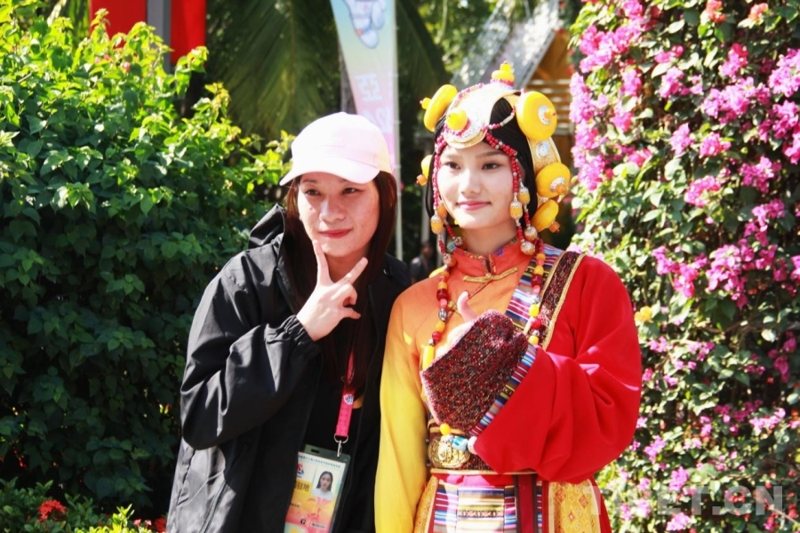 圖為第十二屆全國少數(shù)民族傳統(tǒng)體育運(yùn)動會民族大聯(lián)歡活動現(xiàn)場,來賓與身著藏族服飾的演員合影 攝影:劉莉