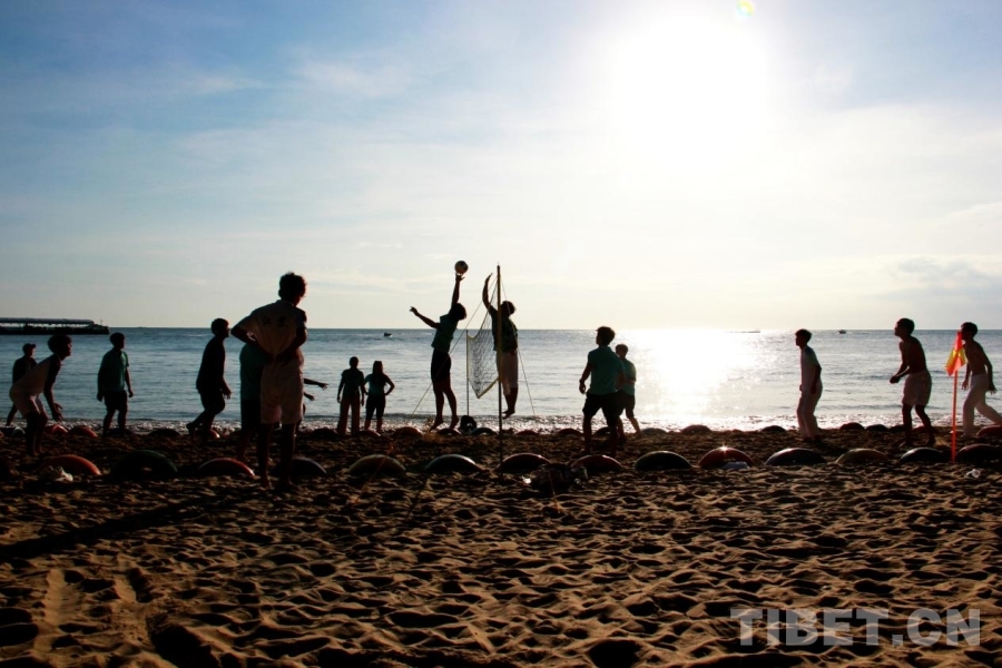 圖為第十二屆全國少數(shù)民族傳統(tǒng)體育運(yùn)動會民族大聯(lián)歡活動現(xiàn)場,各代表團(tuán)運(yùn)動員們感受沙灘排球 攝影:劉莉