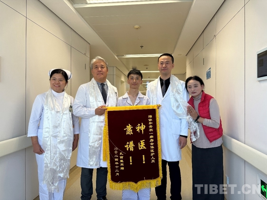 圖為扎西和母親向協(xié)和醫(yī)院骨科醫(yī)療團(tuán)隊(duì)贈(zèng)送錦旗 攝影:楊眉笑