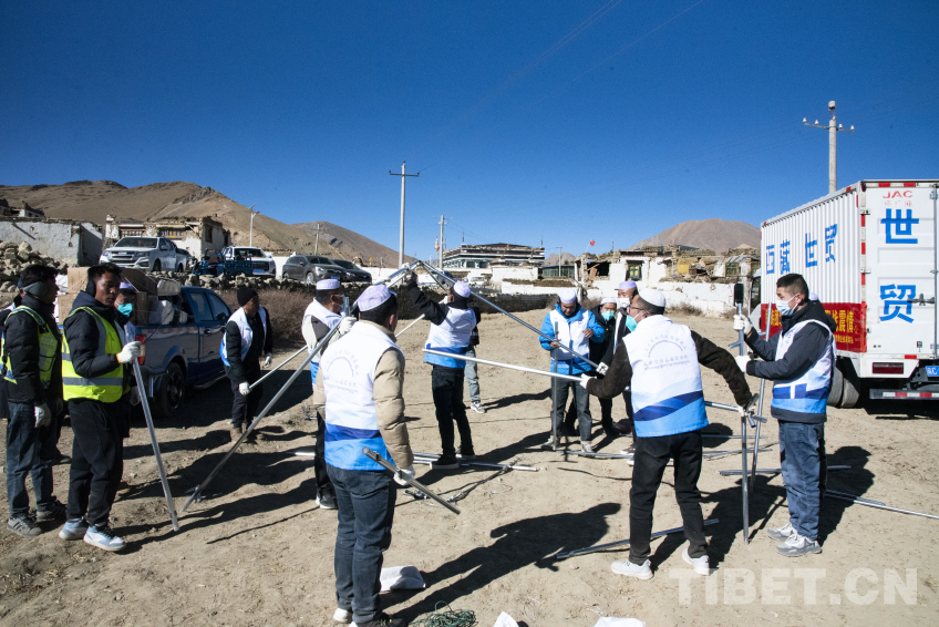 圖為在左措村地震安置點現(xiàn)場,山南市乃東區(qū)甘肅青海企業(yè)家商會愛心人士正在搭建物資發(fā)放帳篷 攝影:趙振宇