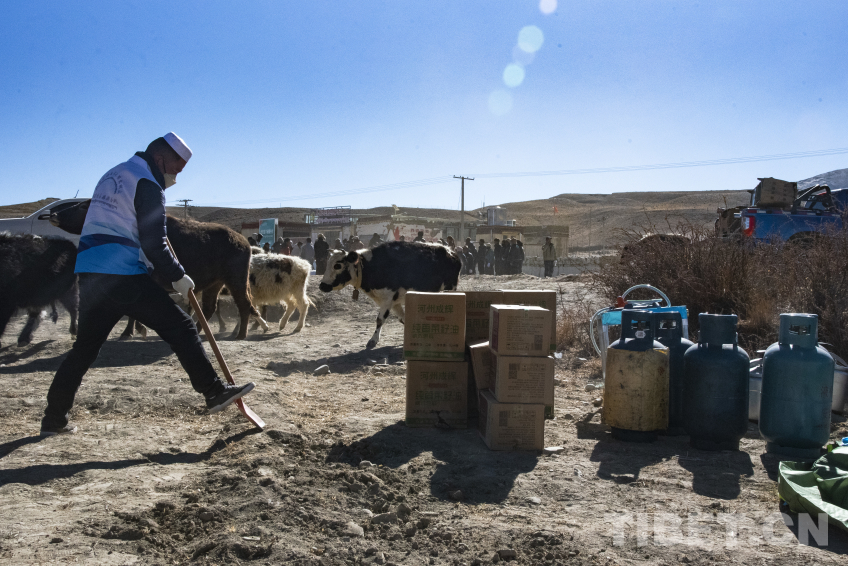 圖為在左措村地震安置點現(xiàn)場,山南市乃東區(qū)甘肅青海企業(yè)家商會愛心人士正在平整土地準備為受災(zāi)群眾做飯 攝影:趙振宇