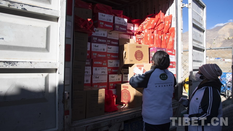 圖為西藏當雄姆蘭農(nóng)業(yè)科技發(fā)展農(nóng)民專業(yè)合作社在嘎旦村受災安置點發(fā)放物資 攝影:趙振宇