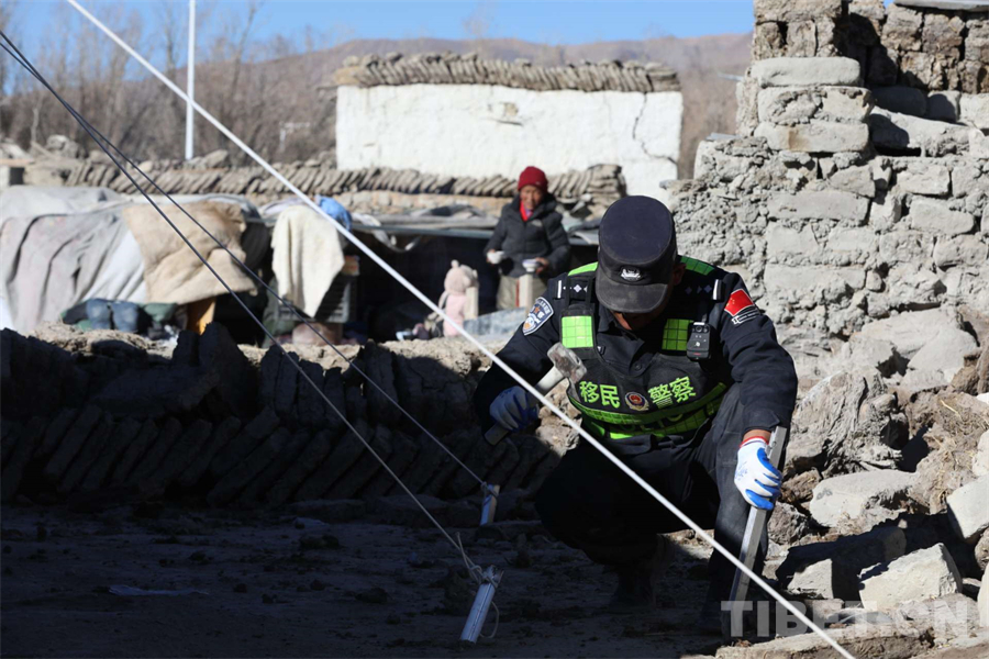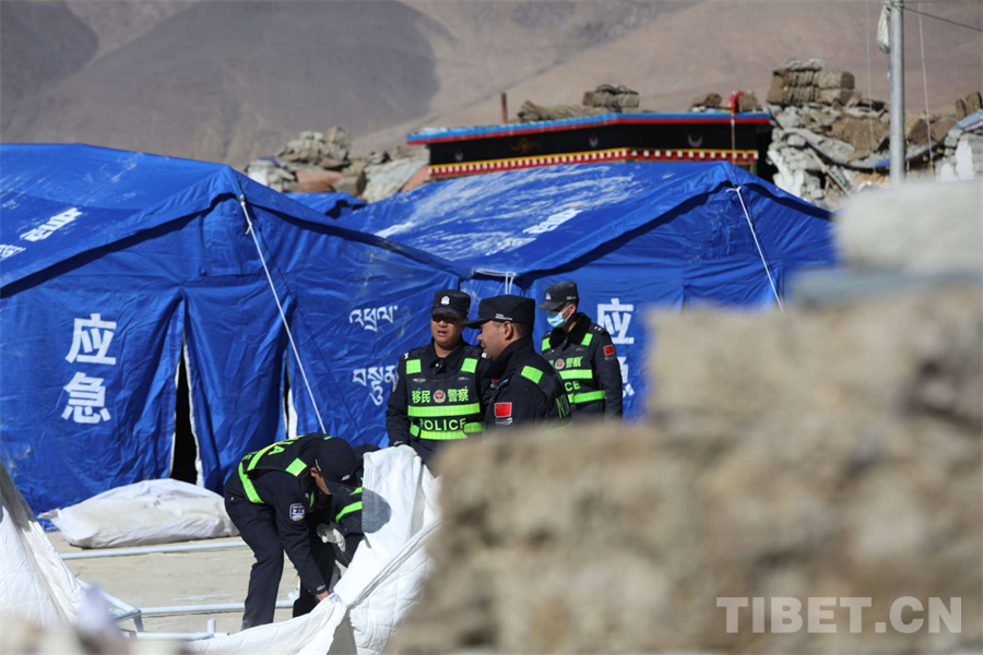 圖為西藏移民管理警察在定日縣長所鄉(xiāng)雜村為受災(zāi)群眾安裝帳篷 攝影:郭遠(yuǎn)敬
