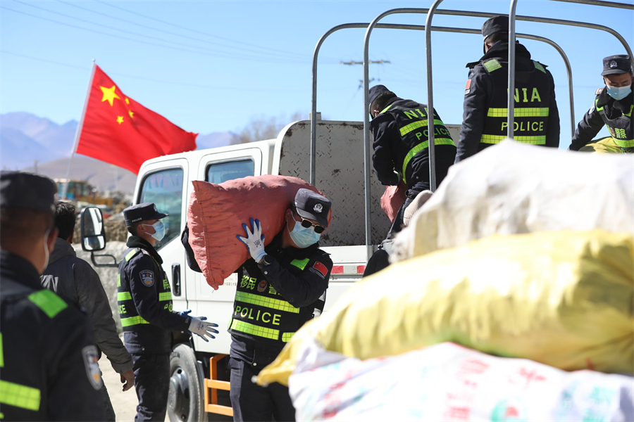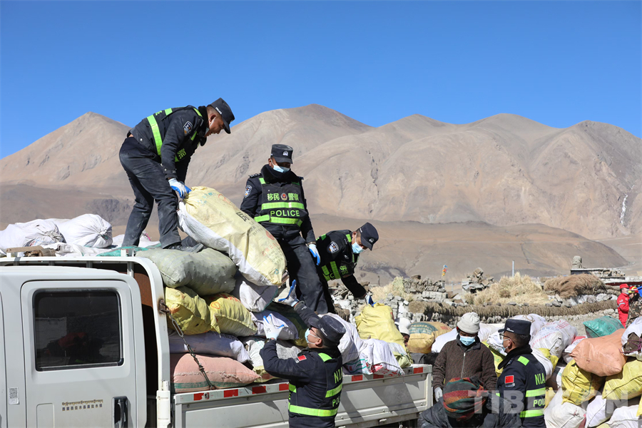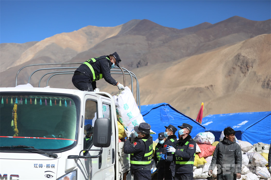圖為西藏移民管理警察在定日縣長所鄉(xiāng)雜村為受災(zāi)群眾轉(zhuǎn)移物資 攝影:郭遠(yuǎn)敬