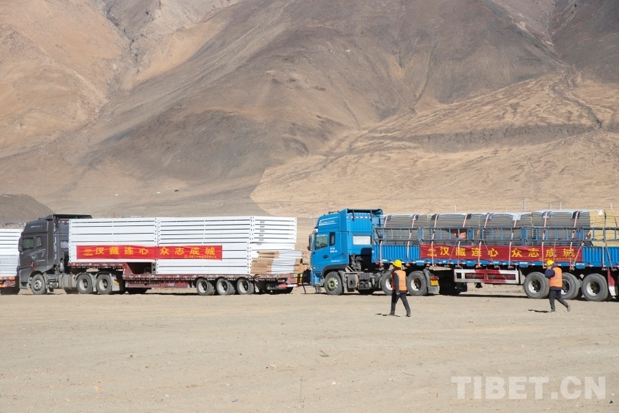圖為工作人員正在日喀則市定日縣長所鄉(xiāng)森嘎村內抓緊搭建活動板房 攝影:趙振宇