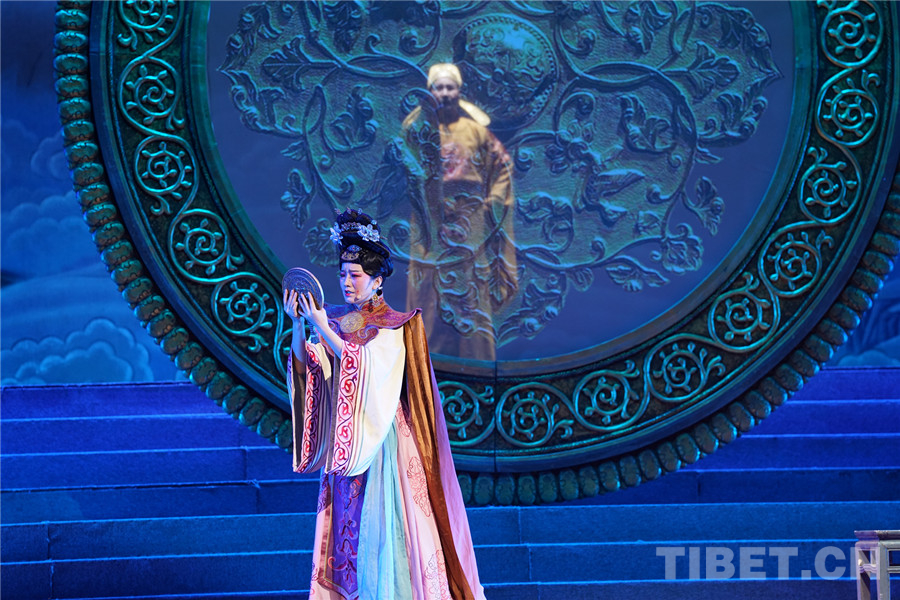 圖為《金城公主》演出現(xiàn)場,和親會盟遭到破壞,金城公主在迷惘中通過銅鏡得到已故父親的指引 攝影:蘇洋