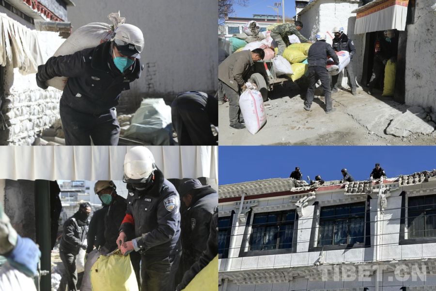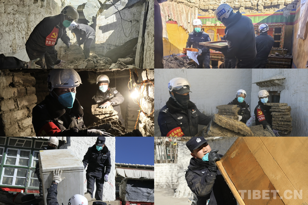 圖為拉孜公安金盾黨員突擊隊(duì)民警們幫災(zāi)區(qū)群眾清理廢墟、轉(zhuǎn)移財(cái)產(chǎn)