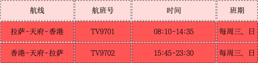 該航線由西藏航空執(zhí)行,計劃每周三、周日執(zhí)飛,航班號TV9701,于8:10拉薩起飛,在天府經(jīng)停后,14:35到達香港;返程航班號TV9702,于15:45香港起飛,在天府經(jīng)停后,23:30到達拉薩。
