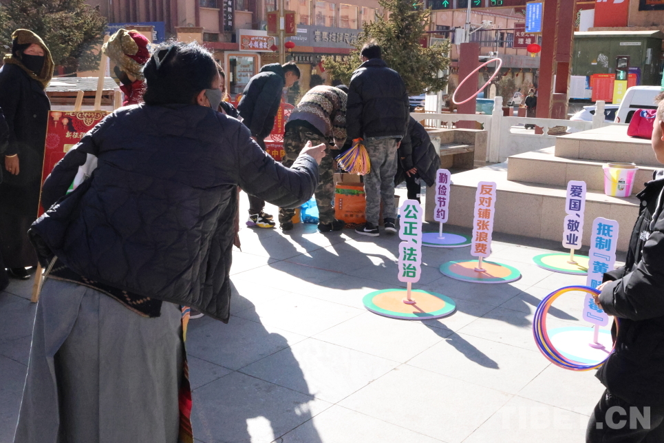 在新時代文明實踐集市,以互動游戲為主,分設了“文明新風”主題套圈游戲和“文明舉止”紅黑榜分類游戲、“垃圾分類”沙包投放游戲、文明家風親子拼圖等項目,每個區(qū)域前都擠滿了游玩體驗的人群?!斑@個套圈游戲很受歡迎,我們把‘愛國敬業(yè)’‘反對鋪張浪費’等社會主義核心價值觀有關內(nèi)容制作成套圈道具,讓大家在趣味活動中了解文明理念。”理塘縣委宣傳部工作人員介紹道。