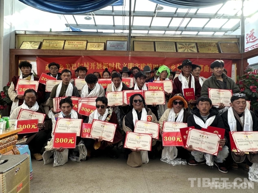 圖為藏比鄉(xiāng)美巴爾村比賽結(jié)束后,獲獎(jiǎng)?wù)吆嫌傲裟?nbsp;