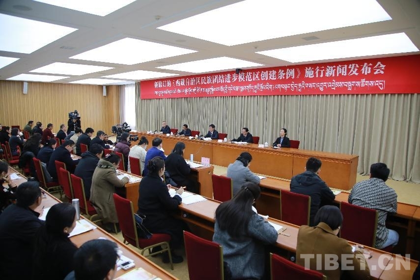 新修訂的《西藏自治區(qū)民族團(tuán)結(jié)進(jìn)步模范區(qū)創(chuàng)建條例》施行新聞發(fā)布會(huì)現(xiàn)場(chǎng)。攝影:趙釗