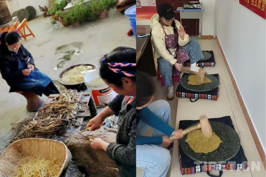 關于藏紙的起源,學術界更偏向《舊唐書·吐蕃》中的記載:唐高宗時期,吐蕃贊普葉宗弄贊(注:松贊干布)“因請蠶種及造酒、碾、磑、紙、墨之匠”,隨文成公主入藏。自此,西藏關于紙的技藝因地而成,代代相傳。1300多年后的一個清晨,在金東鄉(xiāng)的工坊內(nèi),記者見到了金東藏紙制造技藝非遺傳承人加里,也看到了藏紙一大分支——金東藏紙中的古法脈搏。