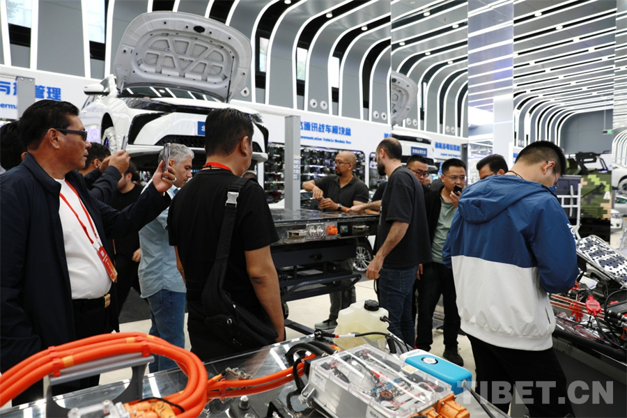 “這是由7104節(jié)電池組成的特斯拉的電池組,它是402伏的高壓電。所以,沒有經(jīng)過專業(yè)培訓(xùn)進(jìn)行電動汽車維修會有一定的危險性?!北狈絿H汽車教育展廳、車間負(fù)責(zé)人黨超為到訪的西藏自治區(qū)工商聯(lián)民營企業(yè)家赴京學(xué)習(xí)參觀團(tuán)一行詳細(xì)介紹著墻上展示的電池組。大家聽得津津有味。