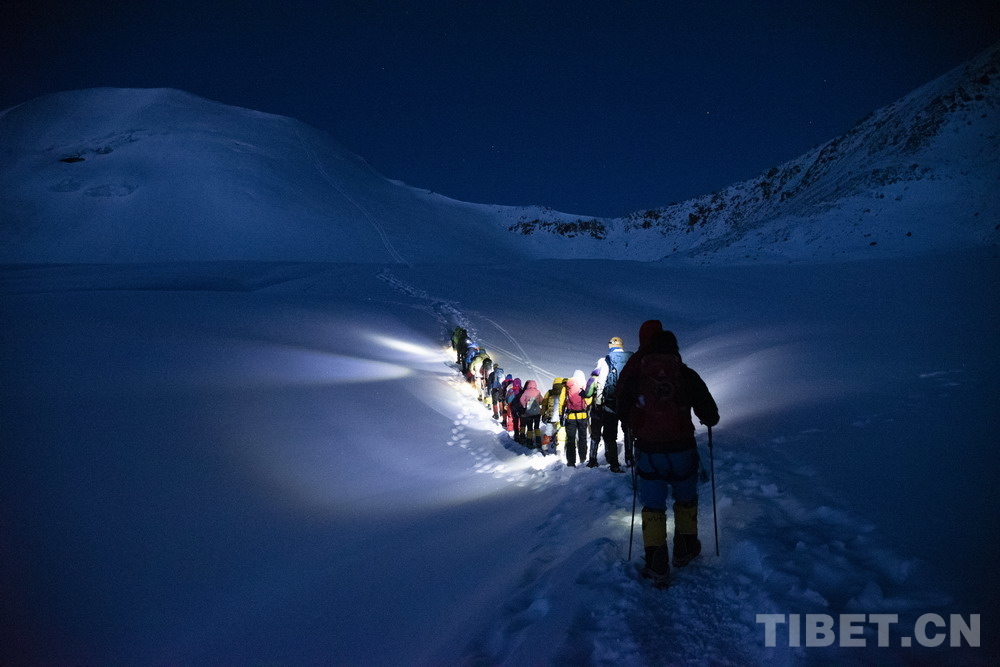 圖為5月3日,登山愛好者在凌晨出發(fā),向海拔6010米的洛堆峰峰頂進發(fā) 攝影:趙振宇