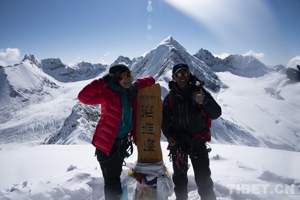 圖為5月3日,來自上海的登山愛好者登頂洛堆峰后與自己的登山向?qū)Ш嫌啊z影:趙振宇
