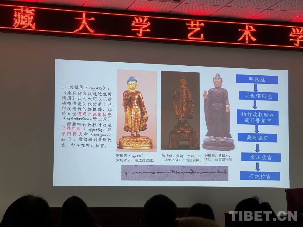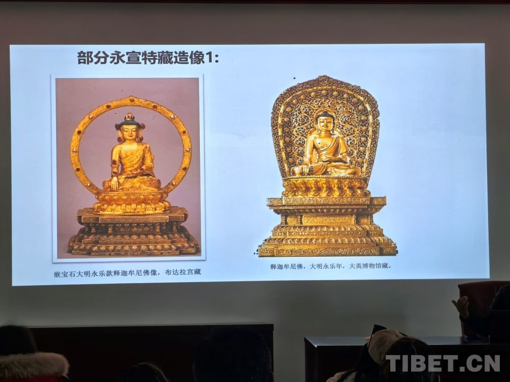 5月8日,在西藏大學(xué)藝術(shù)學(xué)院內(nèi),一場題為《布達(dá)拉宮館藏大明永宣款造像相關(guān)問題考察——兼談“漢地造像殿”的復(fù)原陳設(shè)研究》的講座吸引了眾多學(xué)術(shù)愛好者。布達(dá)拉宮文物管理處文物研究室班旦次仁老師以大量西藏大明永宣款造像為案例,向在場聽眾介紹了這一時(shí)期的佛像如何以媒介的形式增強(qiáng)各民族間的感情。