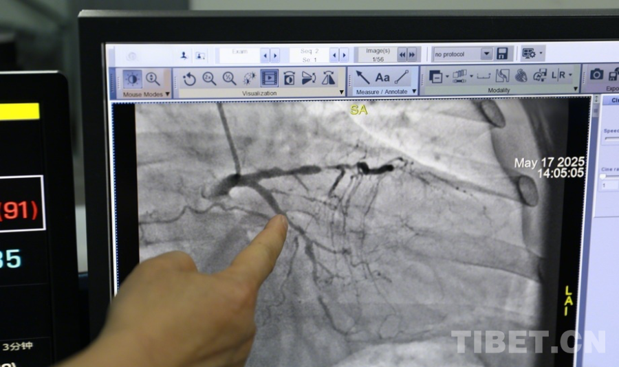 圖為陰赪茜趕赴阿壩州人民醫(yī)院手術(shù)救治急性心?;颊?,屏幕上顯示出患者心臟血管多處問題嚴(yán)重 攝影:劉莉