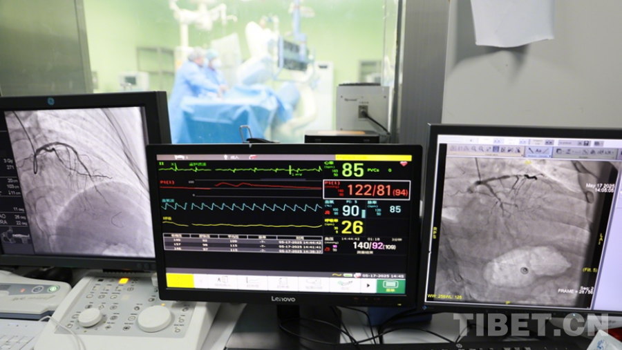 圖為陰赪茜(手術(shù)室內(nèi)右)趕赴阿壩州人民醫(yī)院手術(shù)救治急性心?;颊撸ㄟ^比對屏幕上的畫面,術(shù)后(左側(cè)屏幕)患者的心臟血管血流已較術(shù)前明顯恢復(fù) 攝影:劉莉