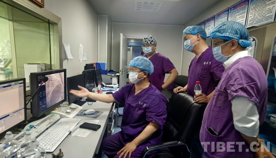 圖為陰赪茜(手術(shù)室內(nèi)右)趕赴阿壩州人民醫(yī)院手術(shù)救治急性心?;颊?,屏幕上顯示出陰赪茜正操作纖細(xì)的導(dǎo)絲嘗試通過患者發(fā)生閉塞的心臟血管 攝影:劉莉