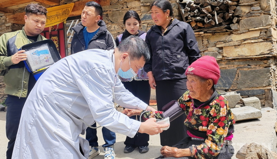 圖為 “同心·共鑄中國心”2025阿壩行大型健康公益綜合服務活動義診醫(yī)療專家在四川省阿壩州馬爾康市草登鄉(xiāng)入戶巡診,為行動不便的老人送醫(yī)送藥 攝影:喇應強