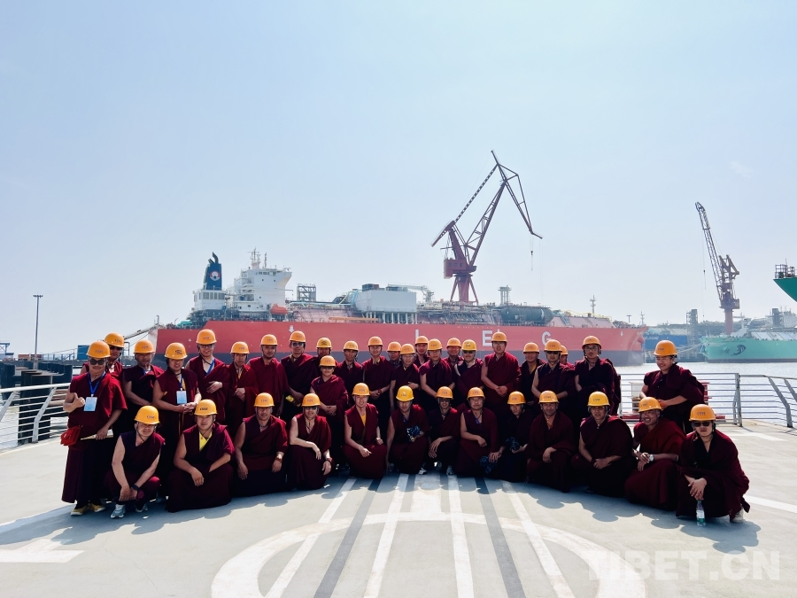 圖為西藏佛學院師生在上海江南造船廠合影,近距離接觸中國制造的先進液化乙烯(LEG)運輸船 攝影:趙振宇