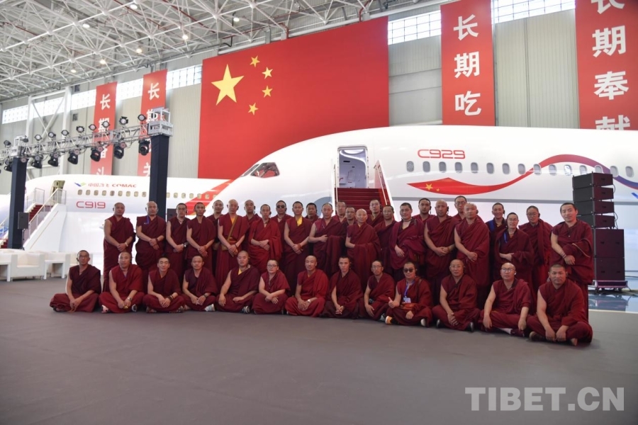 圖為西藏佛學院師生在中國商飛公司展廳合影,了解中國高端制造“新名片”的發(fā)展 攝影:趙振宇