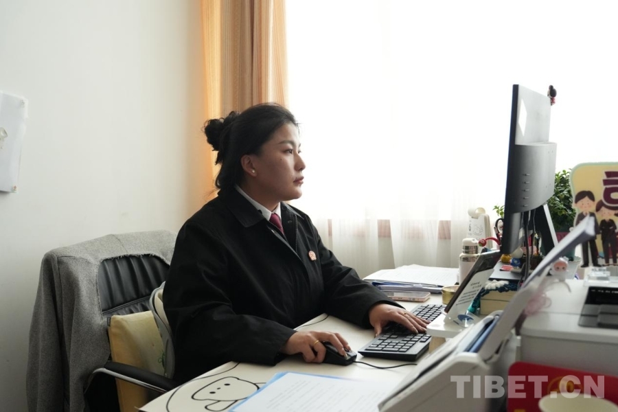 圖為正在辦公的阿里地區(qū)中級(jí)人民法院書(shū)記員尼瑪卓瑪 攝影:邊子捷