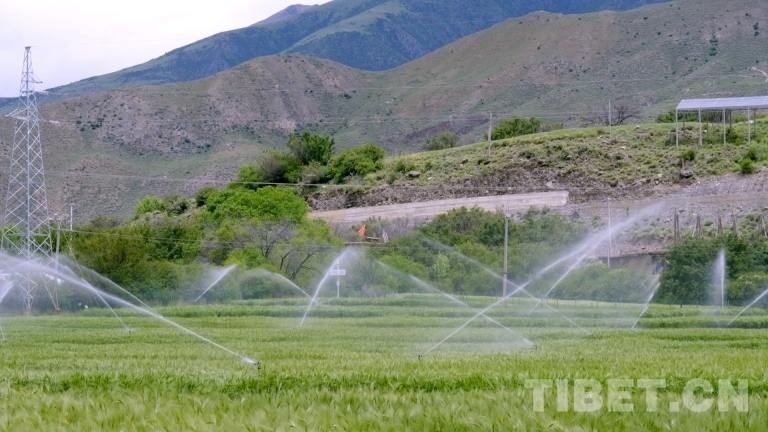圖為西藏洛隆縣俄西鄉(xiāng)現代農業(yè)產業(yè)園內正在噴灑作業(yè)的灌溉設備