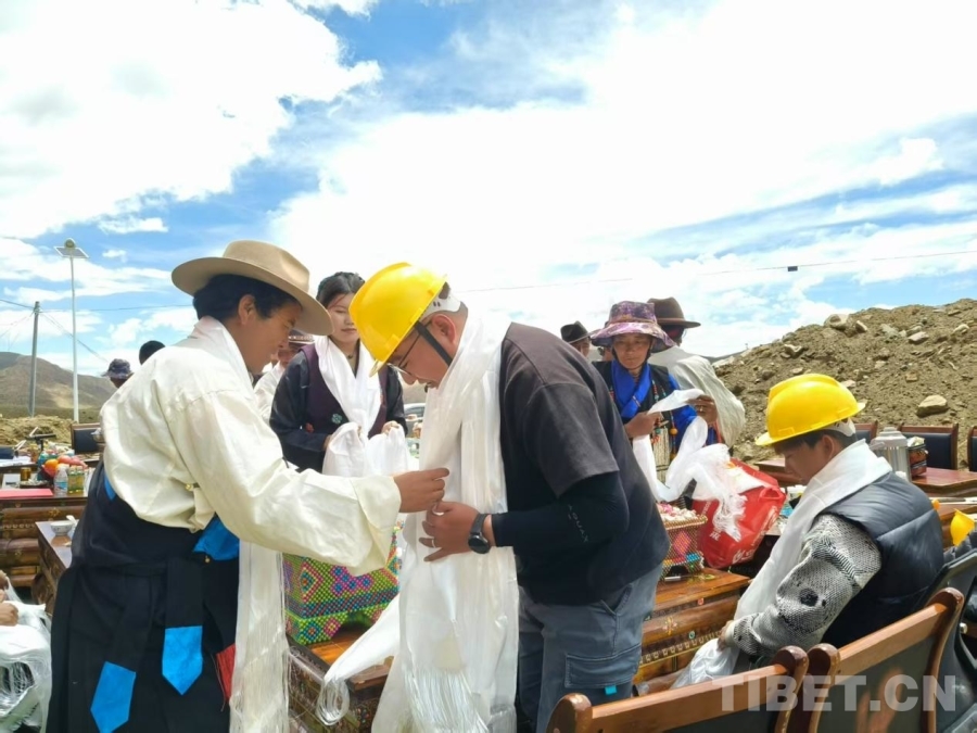 圖為村民向施工隊工作人員敬獻哈達。