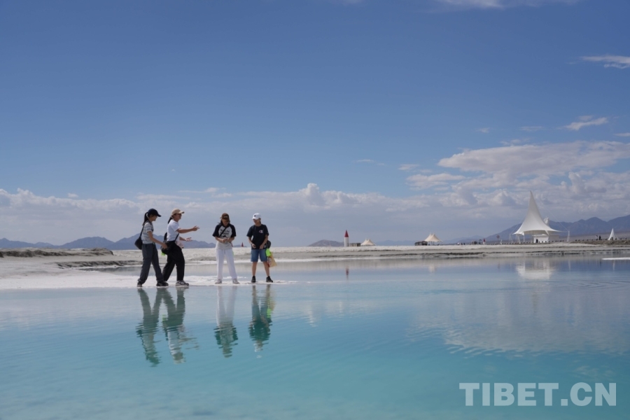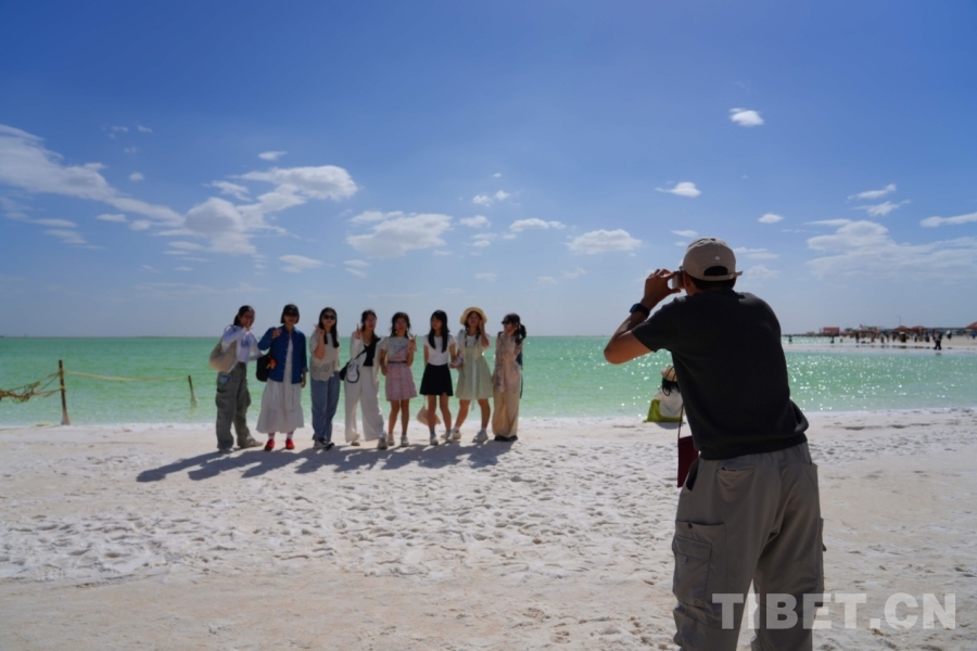 在海西蒙古族藏族自治州格爾木市,海拔2670米的察爾汗鹽湖,翠綠之美令人震撼,風(fēng)起波動,湖面如碎鉆鋪就的星河;天然形成的鹽花形態(tài)各異宛如珊瑚叢生,在陽光下,閃耀著璀璨的光芒;浮在鹵水上的“萬丈鹽橋”延伸至天際,橫跨湖面,還有周邊的現(xiàn)代化采鹽船,輸鹵管道,車來車往,工業(yè)設(shè)施與自然景觀形成強烈對比。來自妙法寺劉金龍中學(xué)三位女生欣賞著美景,也紛紛討論這次令人驚嘆的“自然課堂”。鐘澄情同學(xué)不自禁感慨:“這里跟網(wǎng)上宣傳的一樣美!就像是上帝打翻的蘋果汁。”曾婉晴同學(xué)驚嘆道:“曾經(jīng)我只聽說過茶卡鹽湖,來到這里才知道察爾汗鹽湖是中國最大、世界第二大的鹽湖,面積相當(dāng)于56個茶卡鹽湖,鹽儲量可以讓全球80億人吃上兩千年。”而許馨月同學(xué)更加震撼這里工業(yè)與自然相互交融的獨特魅力,直呼這是一座真正的“寶庫”!