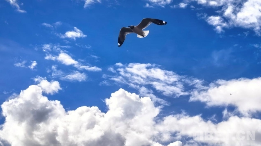 圖為拉薩兩島內(nèi)河綠色生態(tài)廊道一隅,水鳥(niǎo)在天空中飛過(guò) 攝影:劉莉