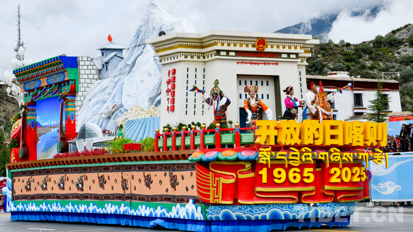 日喀則市彩車,彩車頭部為吉隆口岸造型,象征著日喀則作為面向南亞開放中心城市的特殊戰(zhàn)略地位。國門前,兩名著定日服飾的地震災(zāi)區(qū)群眾代表,手捧切瑪,表達(dá)對以習(xí)近平同志為核心的黨中央的深深感恩之情。