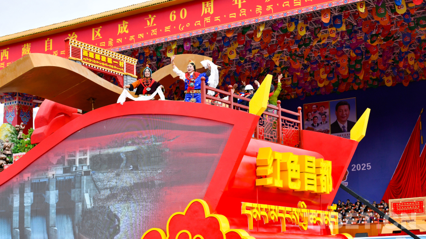“旗幟引領(lǐng)”彩車,車頭矗立巨型黨旗,八面五星紅旗有序排列其后,展現(xiàn)了在黨中央堅強(qiáng)領(lǐng)導(dǎo)下,西藏各族兒女同心同向、團(tuán)結(jié)奮進(jìn)的時代圖景。