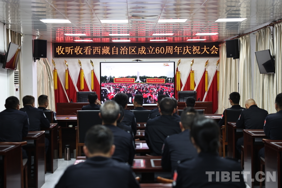圖為聶拉木出入境邊防檢查站組織民警集中觀看西藏自治區(qū)成立60周年慶祝大會(huì)