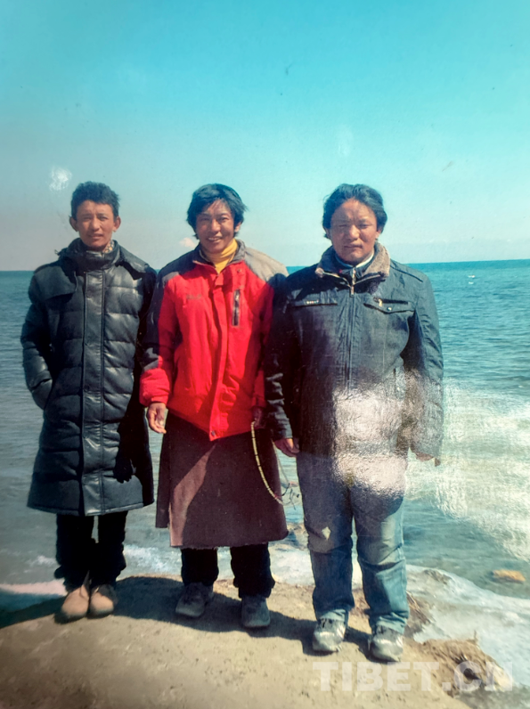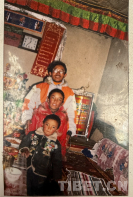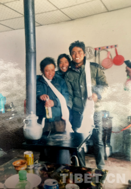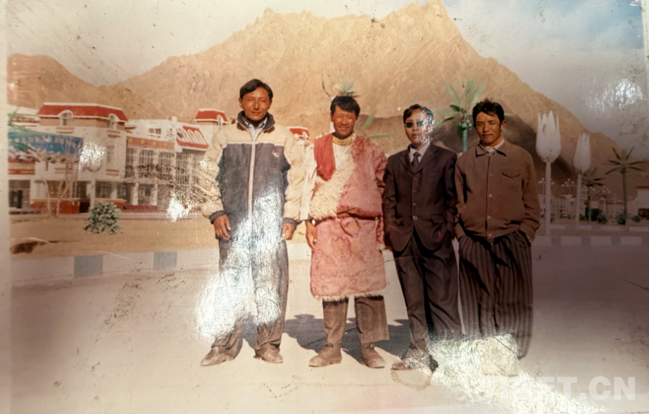 這是九十年代在阿里拍的,拍攝地點(diǎn)是現(xiàn)在的康樂(lè)新區(qū)。從照片上可以看到,那時(shí)候阿里建設(shè)得挺好。右邊第一個(gè)穿燈籠褲的是我。這種褲子當(dāng)時(shí)特別流行,年輕小伙子們穿上可高興了。穿藏袍的是我弟弟,那時(shí)他還是個(gè)普通牧民,后來(lái)通過(guò)自己的努力,已經(jīng)是我們的村長(zhǎng)了。戴墨鏡的是我們同村的,開車時(shí)和人發(fā)生沖突打壞了眼睛,去內(nèi)地治療花了十多萬(wàn)。后來(lái)因?yàn)檠劬?wèn)題駕照被注銷,也就沒(méi)辦法繼續(xù)開車了,現(xiàn)在在拉薩當(dāng)保安。當(dāng)時(shí)他正好在阿里開出租車,我們找到他一起拍了這張照片。左邊的大個(gè)子現(xiàn)在開了個(gè)商店和茶館,生意不錯(cuò)。