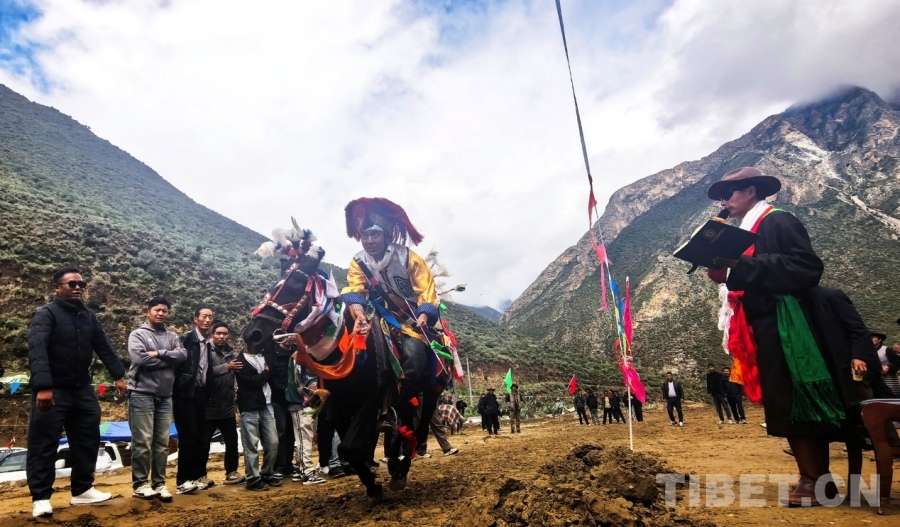 圖為西藏自治區(qū)山南市貢嘎縣昌果鄉(xiāng)普夏村望果節(jié)賽馬會(huì)上村里請(qǐng)來的民間藝人(圖右)擔(dān)任主持人介紹出場(chǎng)騎手 攝影:劉莉