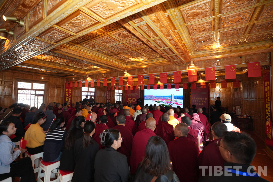 中國(guó)西藏網(wǎng)訊 9月3日上午,紀(jì)念中國(guó)人民抗日戰(zhàn)爭(zhēng)暨世界反法西斯戰(zhàn)爭(zhēng)勝利80周年大會(huì)在北京天安門(mén)廣場(chǎng)隆重舉行,以盛大閱兵儀式,同世界人民一道紀(jì)念這個(gè)偉大的日子,共同開(kāi)創(chuàng)更加光明的未來(lái)。同一時(shí)刻,在云南省迪慶藏族自治州香格里拉市松贊林寺,130余名我國(guó)宗教界人士觀看大會(huì)直播,共同見(jiàn)證這一歷史性時(shí)刻,感受新時(shí)代中國(guó)國(guó)防力量,激蕩愛(ài)國(guó)愛(ài)教情懷。
