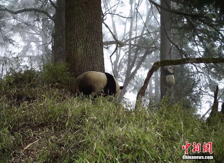 大熊貓媽媽在樹下時(shí)而愜意地?fù)习W癢,時(shí)而愉快地蹭蹭嗅味樹。半歲左右的大熊貓寶寶,像一顆糯米團(tuán)子粘在不遠(yuǎn)處的樹干上。四川臥龍國(guó)家級(jí)自然保護(hù)區(qū)管理局供圖