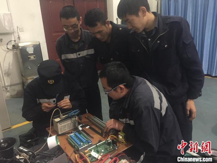 圖為黨磊在研判車輛故障?!〔探ㄍ?攝