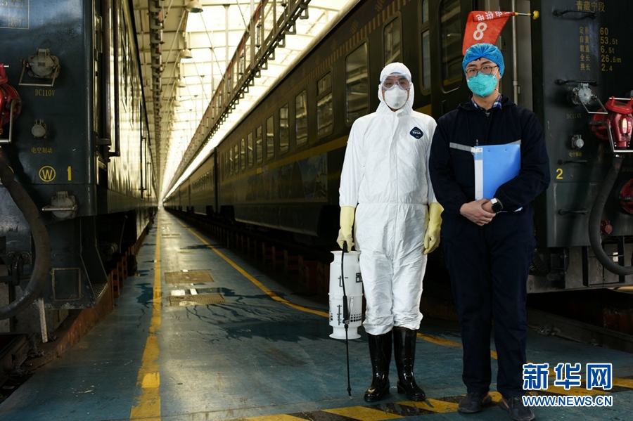 在西寧車輛段車庫內(nèi),防疫人員對(duì)每列旅客列車進(jìn)行全面殺毒。新華網(wǎng) 李俊 攝