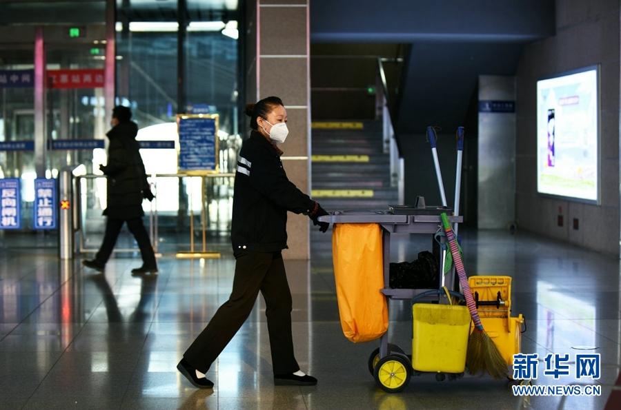 工作人員對(duì)每一列旅客列車進(jìn)行消毒作業(yè)。新華網(wǎng) 郝寶君 攝
