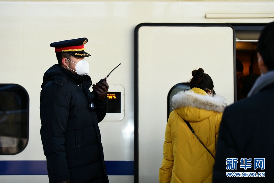 工作人員引導(dǎo)旅客乘坐列車。新華網(wǎng) 李俊 攝