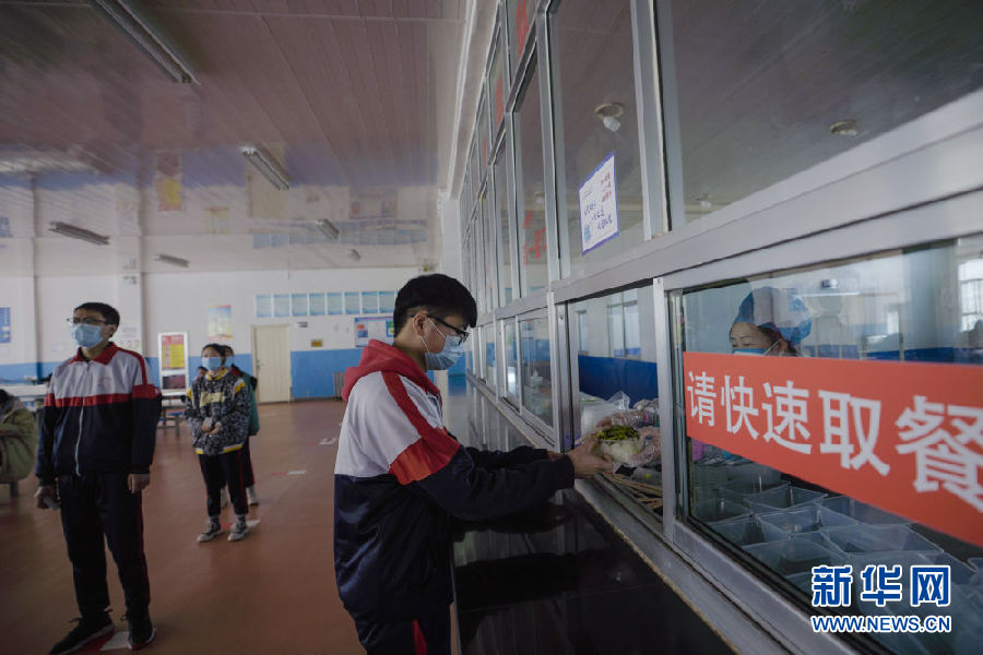 3月14日,海北州第一高級中學(xué)學(xué)生在餐廳排隊(duì)取餐。新華社 吳剛 攝