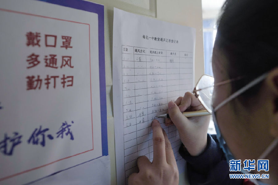 3月14日,海北州第一高級中學(xué)學(xué)生柳逢靈在記錄教室通風(fēng)情況。新華社 吳剛 攝